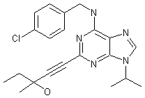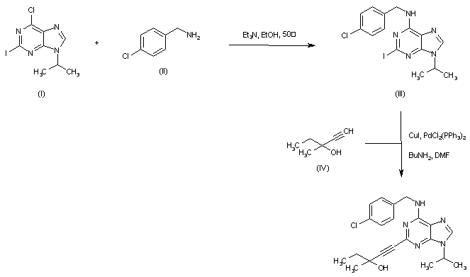 Condensation of 6-chloro-2-iodo-9-isopropylpurine (I) with 4-chlorobenzylamine (II) in hot EtOH afforded the 6-(benzylamino)purine (III). Subsequent Suzuki coupling of (III) with 3-methylpent-1-yn-3-ol (IV) in the presence of Pd(0) and CuI produced the target 2-ethynylpurine derivative.