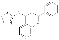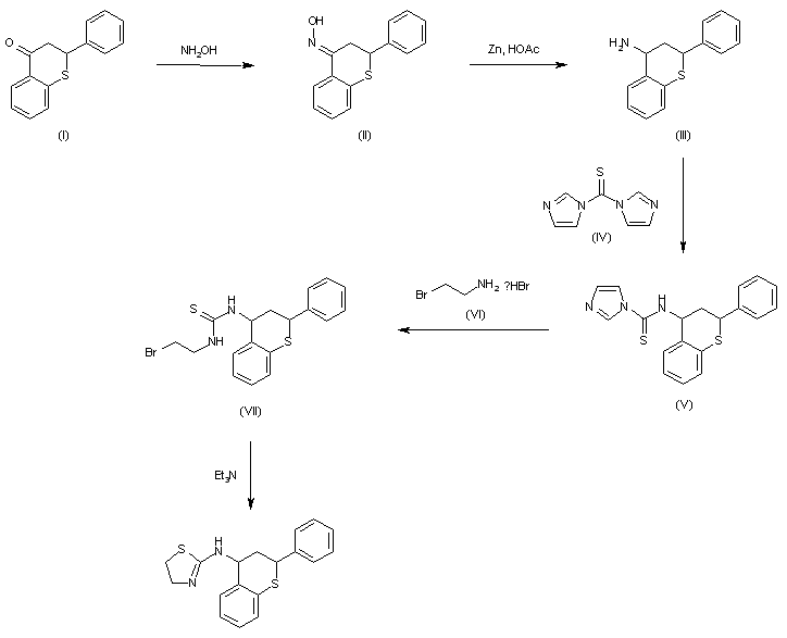 2-Phenyl-3,4-dihydro-2H-1-benzothiopyran-4-one (I) was converted to oxime (II) upon treatment with hydroxylamine, and subsequently reduced to amine (III) by means of Zn and HOAc. Condensation of (III) with thiocarbonyl diimidazole (IV) produced the thioimidazolide (V), that was displaced with 2-bromoethyl amine (VI) to furnish thiourea (VII). Finally, cyclization of the N-(bromoethyl)thiourea (VII) in the presence of Et3N produced the target thiazoline derivative.