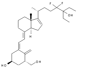 1-Ethylideneperhydroindan-4-ol (I) reacts with Me2AlCl and paraformaldehyde via an ene process to give the homoallylic diol (II), the primary hydroxyl group of which is tosylated by means of TsCl and DMAP and the secondary hydroxyl group silylated by means of TESOTf and lutidine to yield (III). Conversion of (III) into the corresponding nitrile by means of KCN in DMSO, followed by reduction with DIBALH in toluene, affords the aldehyde (IV) (1), which is further reduced in THF by treatment with DIBALH in hexanes to yield (V). The hydroxy silyl ether (V) is then converted into the iodo derivative (VI) by treatment with PPh3, imidazole and I2 in dichloromethane. The iodo silyl ether (VI) reacts with t-BuSH in the presence of DBU in benzene to afford sulfide (VII), which is then oxidized and deprotected with oxone to provide the hydroxy sulfone (VIII). Oxidation of (VIII) with pyridinium dichromate (PDC) in CH2Cl2 gives the keto sulfone (IX), which reacts with the phosphine oxide derivative (X) in THF in the presence of PhLi. Finally, the protecting silyl ether moiety is removed by means of Bu4NF in THF.