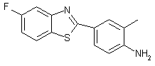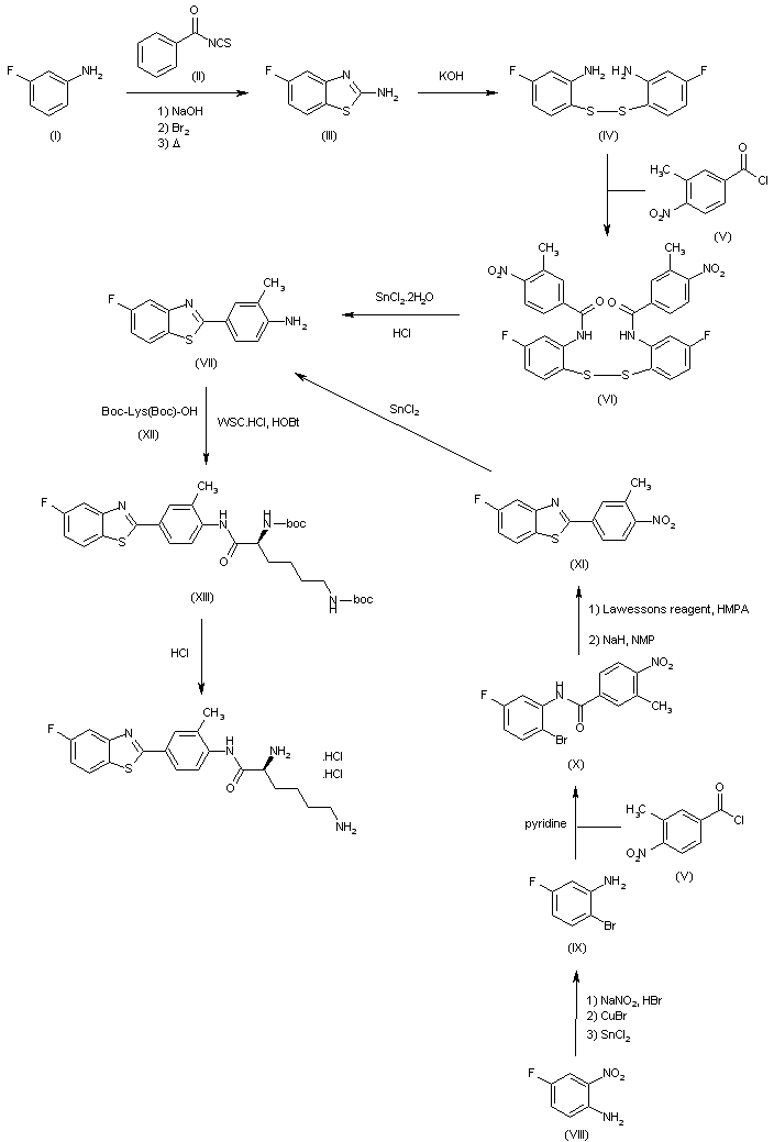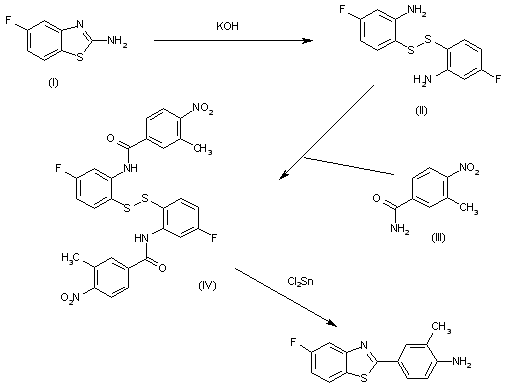The reaction of 5-fluorobenzothiazol-2-amine (I) with KOH in refluxing water gives the disulfide (II), which is treated with 3-methyl-4-nitrobenzoyl chloride (III) in refluxing pyridine to yield the bis-benzamide (IV). Finally, this compound is reductively cyclized by reaction with SnCl2 and HCl in ethanol/water to afford the target aminophenyl benzothiazole.