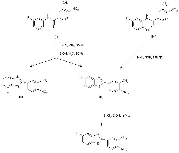 Jacobsen radical cyclization of thiobenzanilide (I) in the presence of potassium ferricyanide produced a mixture of the desired benzothiazole (III) and minor amounts of its regioisomer (II). An alternative regiospecific synthesis of (III) consisted in the intramolecular cyclization of the ortho-bromo thiobenzanilide (IV) by means of NaH in hot NMP. Further reduction of the nitro group of (III) using SnCl2 in EtOH gave the desired amino compound.