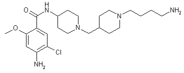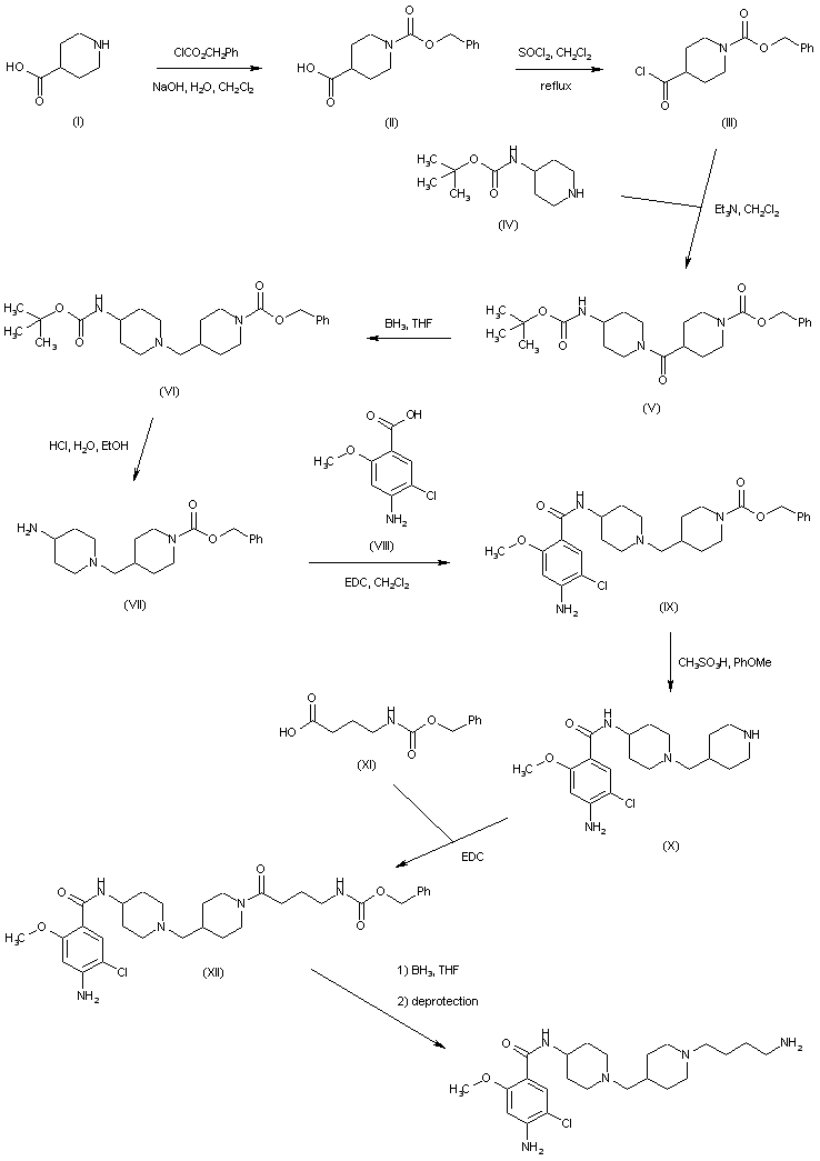 Isonipecotic acid (I) was protected with benzyl chloroformate and the resultant 1-(benzyloxycarbonyl)piperidine-4-carboxylic acid (II) was subsequently converted to the corresponding acid chloride (III) by treatment with SOCl2. Coupling of acid chloride (III) with 4-(tert-butoxycarbonylamino)piperidine (IV) afforded the piperidinyl amide (V), which was further reduced with BH3 to the piperidinylmethyl piperidine (VI). Aminopiperidine (VII), obtained by acidic cleavage of the N-Boc group of (VI), was then coupled with 4-amino-5-chloro-2-methoxybenzoic acid (VIII) to provide amide (IX). Deprotection of the N-benzyloxycarbonyl group was carried out by means of methanesulfonic acid in the presence of anisole to give (X). Acylation of piperidine (X) with the protected aminoacid (XI) yielded amide (XII). Then, selective reduction of the aliphatic amide function, followed by deprotection of the amino group provided the title compound.