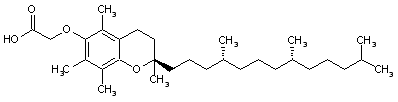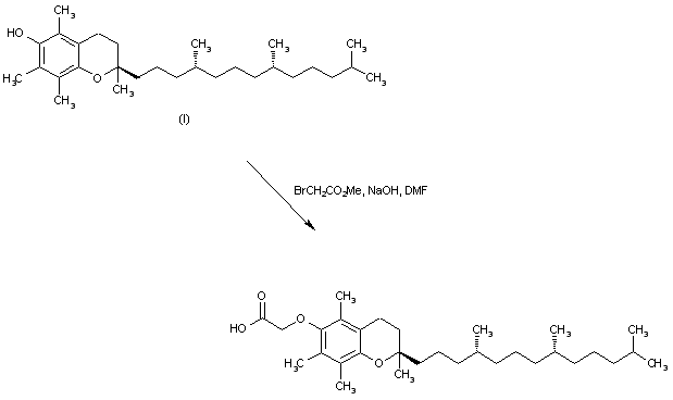 Alkylation of R,R,R-alpha-tocopherol (I) with methyl bromoacetate in the presence of NaOH in DMF takes place with simultaneous hydrolysis of the methyl ester function to furnish the title carboxylic acid.