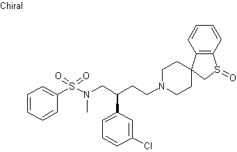 Alkylation of 3-chlorophenylacetic acid (I) with allyl bromide (II) using lithium hexamethyldisilazide provided racemic (III), which was resolved by recrystallization of the corresponding diastereoisomeric salts with (S)-alpha-methylbenzylamine. The desired (S)-carboxylic acid (IV) was converted to acid chloride and then treated with methylamine yielding amide (V). Reduction of (V) with LiAlH4 gave amine (VI), which was acylated with benzenesulfonyl chloride to afford sulfonamide (VII). A two-step oxidation of the allyl group of (VII) with osmium tetroxide and N-methylmorpholine N-oxide, followed by sodium periodate cleavage of the resulting diol produced aldehyde (VIII). Reductive condensation of (VIII) with spiro piperidine (IX) using NaBH(OAc)3 furnished adduct (X). Final oxidation of the sulfide group of (X) with one equivalent of Oxone(r) afforded the title sulfoxide.