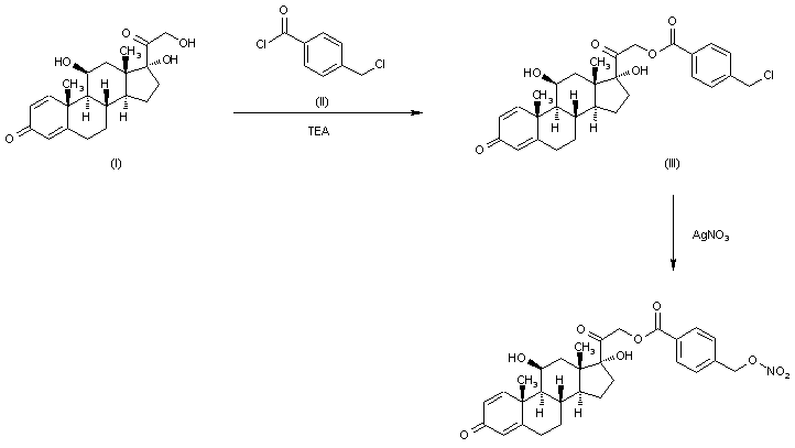 The esterification of prednisolone (I) with 4-(chloromethyl)benzoyl chloride (II) by means of TEA in THF gives the corresponding benzoate (II),which is treated with silver nitrate in refluxing acetonitrile/THF to yield the target nitrate ester.