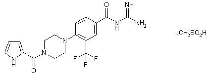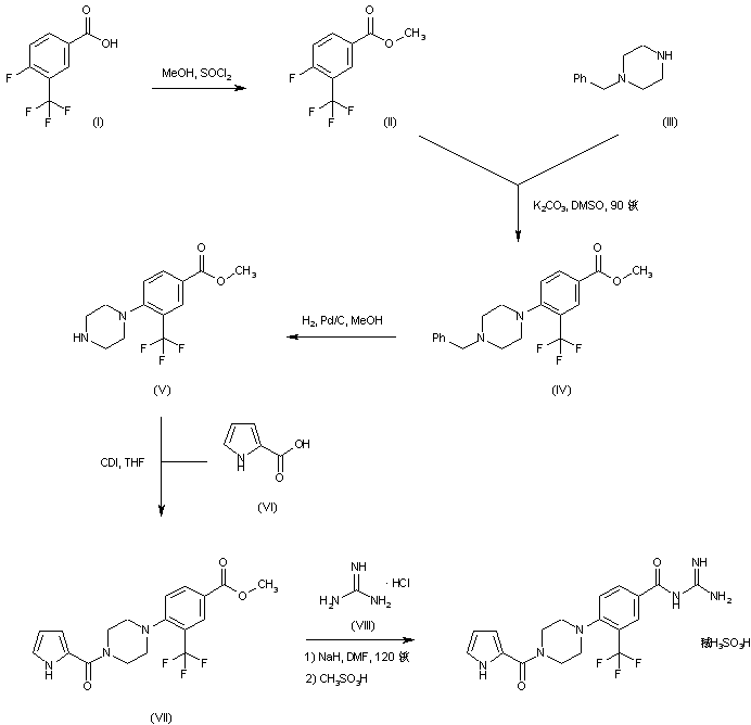 4-Fluoro-3-trifluoromethylbenzoic acid (I) is esterified employing MeOH and SOCl2 to afford the methyl ester (II). Displacement of the 4-fluoride of (II) with N-benzylpiperazine (III) in hot DMSO yields the piperazinyl benzoate (IV). The N-benzyl group of (IV) is then removed by hydrogenolysis over Pd/C to yield the deprotected piperazine (V), which is further coupled with 2-pyrrolecarboxylic acid (VI) by means of CDI producing amide (VII). Finally, displacement of the methyl ester of (VII) with guanidine (VIII) gives rise to the target acyl guanidine, which is converted to the corresponding mesylate salt