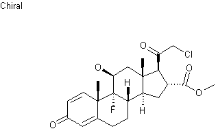 The known 9alpha-fluoroprednisolone-16alpha-carboxylate derivative (I) was reacted with methanesulfonyl chloride and triethylamine to give the primary mesylate (II). Displacement of the mesylate group of (II) by LiCl in hot DMF produced the title chloro ketone.