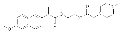 The hydroxyethyl ester of naproxen (II) was synthesized by treatment of the sodium salt of naproxen (I) with 2-bromoethanol. Condensation of (II) with (4-methyl-1-piperazinyl)acetic acid (III) in the presence of dicyclohexylcarbodiimide and 4-(dimethylamino)pyridine yielded the title compound.