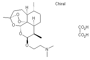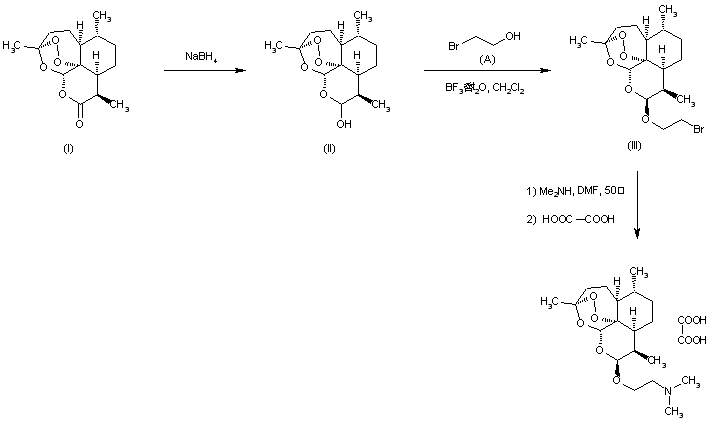 Dihydroartemisinin (II) was prepared by NaBH4 reduction of artemisinin (I). Condensation of (II) with 2-bromoethanol (A) in the presence of boron trifluoride etherate yielded the 10beta-bromoethyl acetal (III). Finally, reaction of (III) with dimethylamine in DMF provided the desired amine, which was finally converted to the oxalate salt.