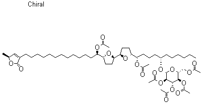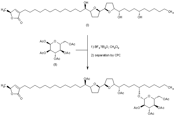 Squamocin (I) was isolated from the seeds of Annona spinescens, the bark of Annona salzmanii, and the seeds of Annona atemoya, and was dried by azeotropic distillation with toluene. Glycosylation with pentaacetyl-alpha-D-glucopyranose (II) in the presence of boron trifluoride etherate produced a mixture of the target 15,24-diacetyl-28-(tetraacetyl-beta-D-glucosyl)squamocin and three other acetylated glucosides, which were separated by means of centrifugal partition chromatography.