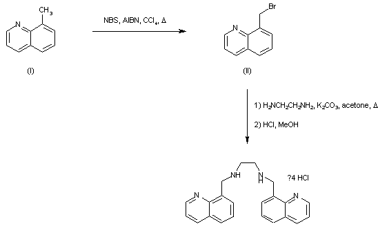 Benzylic bromination of 8-methylquinoline (I) by means of N-bromosuccinimide afforded 8-(bromomethyl)quinoline (II). Dimerization of (II) using ethylenediamine gave the corresponding bis(quinolylmethyl)ethylenediamine, which was finally converted to the tetrahydrochloride salt.
