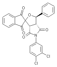 The condensation of indane-1,3-dione (I) with benzaldehyde (II) by means of piperidine in refluxing benzene gives 2-benzylideneindane-1,3-dione (II), which is treated with H2O2 and NaOH in methanol to yield the epoxide (IV). The condensation of (IV) with N-(3,4-dichlorophenyl)maleimide (V) (obtained by condensation of 3,4-dichloroaniline (VI) with maleic anhydride (VII) in diethyl ether) in refluxing benzene affords the title product as a mixture of two diastereomeric racemates that are separated by column chromatography.