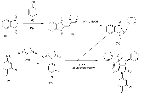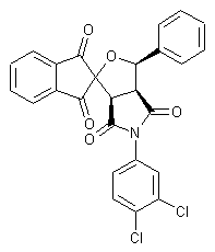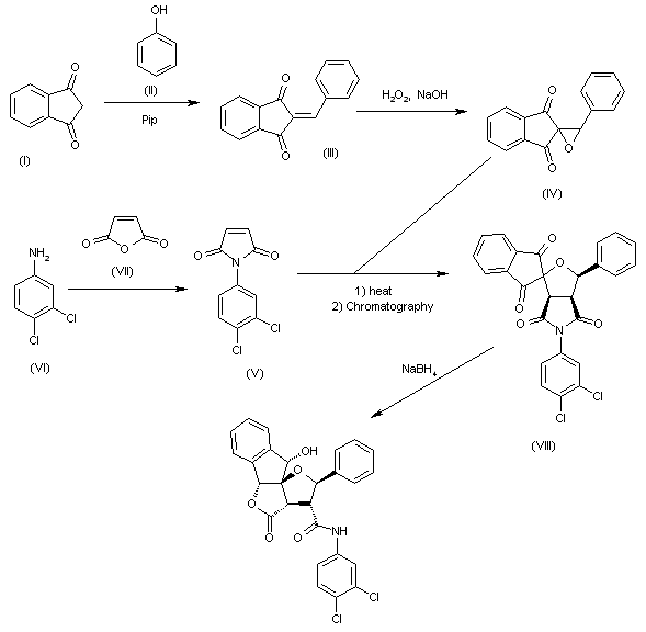 The condensation of indane-1,3-dione (I) with benzaldehyde (II) by means of piperidine in refluxing benzene gives 2-benzylideneindane-1,3-dione (II), which is treated with H2O2 and NaOH in methanol to yield the epoxide (IV). The condensation of (IV) with N-(3,4-dichlorophenyl)maleimide (V) (obtained by condensation of 3,4-dichloroaniline (VI) with maleic anhydride (VII) in diethyl ether) in refluxing benzene affords the title product as a mixture of two diastereomeric racemates that are separated by column chromatography.