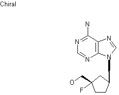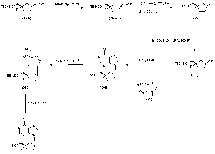 Hydrolysis of (XIIIa-b) to the carboxylic acid (XIVa-b), and further iodo decarboxylation yielded a mixture of epimeric iodides (XVa-b). From hydrolysis of the iodide group of (XVa-b) with NaHCO3 only the alpha-alcohol (XVI) was isolated. This was condensed with 6-chloropurine (XVII) under Mitsunobu conditions to give adduct (XVIII). The 6-chloro derivative (XVIII) was converted into the protected adenosine analogue (XIX) by treatment with methanolic ammonia in a steel bomb at 100 C. Finally, desilylation of (XIX) employing tetrabutylammonium fluoride furnished the title compound.