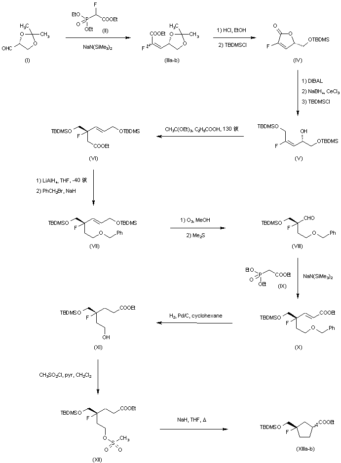 Horner-Emmons condensation of 2,3-isopropylidene-D-glyceraldehyde (I) with phosphonate (II) produced the unsaturated ester (IIIa-b). Ketal deprotection and lactone ring closure of (II) under acidic conditions, followed by O-silylation afforded (IV). The lactone function of (IV) was reduced with DIBAL and then with NaBH4-CeCl3 to produce the corresponding diol. Further silylation of the primary hydroxyl group furnished (V). Condensation of (V) with triethyl orthoacetate followed by Claisen rearrangement gave rise to the gamma,delta-unsaturated ester (VI). This was reduced to alcohol with LiAlH4 and then alkylated with benzyl bromide to yield benzyl ether (VII). Ozonization of (VII) in methanol at -78 C, followed by decomposition of the ozonide with dimethyl sulfide gave aldehyde (VIII). Horner-Emmons condensation of (VIII) with the sodium salt of triethyl phosphonoacetate (IX) produced the alpha,beta-unsaturated ester (X). Double bond hydrogenation in (X) with simultaneous benzyl group cleavage afforded hydroxy ester (XI), which was then converted to mesylate (XII). This was cyclized to the cyclopentane (XIIIa-b) by means of NaH in refluxing THF.