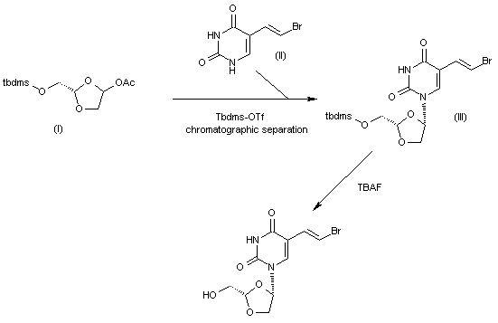 The condensation of the chiral dioxolane (I) with 5(E)-(2-bromovinyl)uracil (II) by means of Tbdms-OTf and lutidine gives the silylated nucleoside (II), which is purified by chromatography. Finally, this compound is deprotected by means of TBAF in acetonitrile. (1,2)
