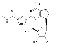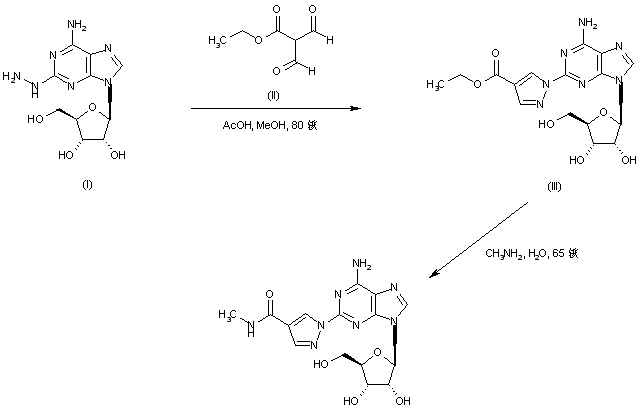 The condensation of 2-hydrazino adenosine (I) with (ethoxycarbonyl)malondialdehyde (II) generated the pyrazole ester (III). The target amide was then obtained by displacement of the ethyl ester group of (III) with an aqueous solution of methylamine at 65 C.