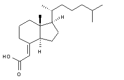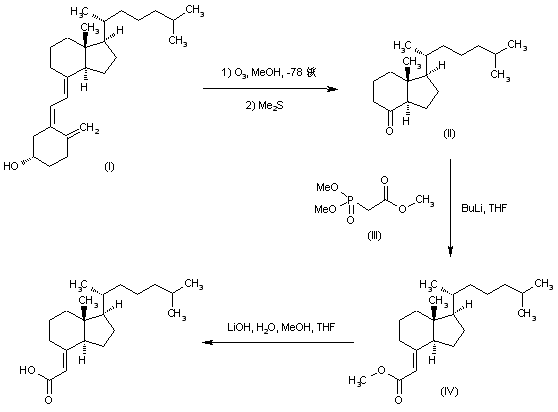 Indanone derivative (II) was obtained as the major product from the ozonolysis of vitamin D3 (I). Horner-Emmons condensation of ketone (II) with trimethyl phosphonoacetate (III) provided the unsaturated ester (IV). This was finally hydrolyzed to the corresponding carboxylic acid by treatment with LiOH.