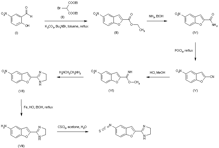 5-Nitrosalicylaldehyde (I) was condensed with diethyl bromomalonate (II) to give ethyl 5-nitrobenzofuran-2-carboxylate (III), which was converted into the corresponding primary amide (IV) by reaction with ethanolic ammonia. Dehydration of amide (IV) to the nitrile (V) was effected by treatment with POCl3. After formation of imidate (VI) with HCl/MeOH, cyclization with ethylenediamine produced the imidazoline (VII). The nitro group of (VII) was then reduced to amine (VIII) using Fe and HCl. This was finally converted to the title isothiocyanate by reaction with thiophosgene.