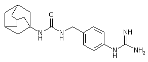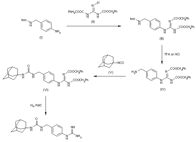 Guanidilation of substituted aniline (I) with protected guanidine (II) provides derivative (III), whose Boc group is removed by treatment with TFA or HCl to afford (4-aminomethyl)phenyl-2,3-di(benzyloxycarbonyl)guanidine (IV). Finally, the target product is obtained by coupling of (IV) with 1-adamantyl-isocyanate (V), followed by removal of the protecting group by hydrogenation over Pd/C.