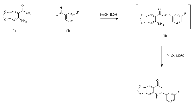 The compound was prepared by condensation of acetophenone (I) with 3-flourobenzaldehyde (II) in refluxing ethanolic NaOH, followed by cyclization of the intermediate chalcone in diphenyl ether at 180 C.