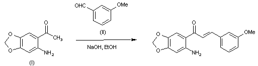 The desired 2'-amino chalcone is synthesized by a base-catalyzed condensation of 2-amino acetophenone (I) and benzaldehyde (II) by means of aqueous NaOH in EtOH.