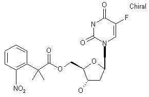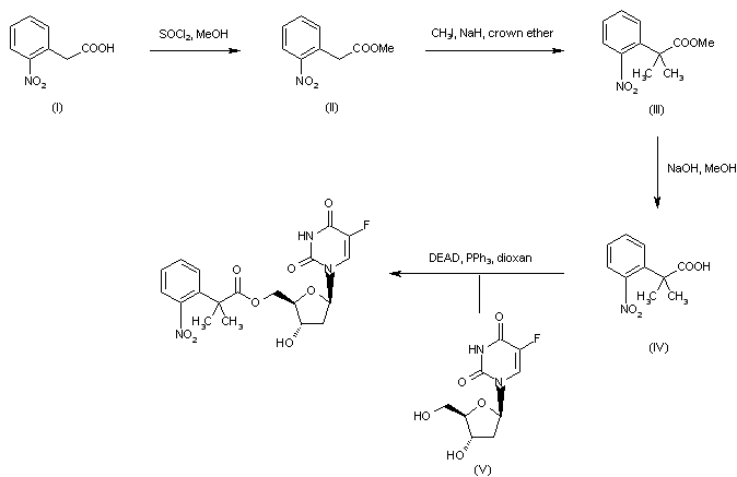Esterification of 2-nitrophenylacetic acid (I) with SOCl2 in MeOH produced methyl ester (II). Subsequent dialkylation of (II) using methyl iodide and NaH in the presence of 18-crown-6 gave methyl 2-nitrophenyl-2-methylpropionate (III), which was hydrolyzed to carboxylic acid (IV) with NaOH in MeOH. Finally, chemoselective acylation of the primery hydroxy group of 5-fluoro-2'-deoxyuridine (V) with (IV) under Mitsunobu conditions yielded the title ester.