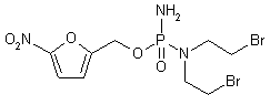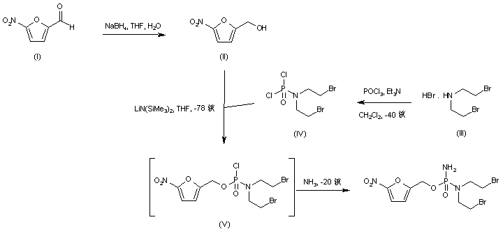 Reduction of 5-nitro-2-furaldehyde (I) with NaBH4 provided the corresponding alcohol (II). The phosphoramidic dichloride (IV) was prepared by treatment of bis(2-bromoethyl)amine (III) with phosphorus oxychloride in the presence of triethylamine at -40 C. Condensation of acid chloride (IV) with the lithium alkoxide of (II) at -78 C produced the intermediate (V), which was treated in situ with gaseous ammonia at -20 C, yielding the title phosphorodiamidate.