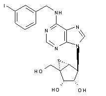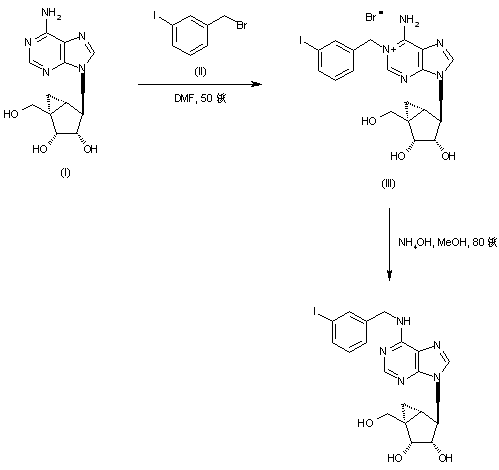 The known methanocarba-adenosine (I) was alkylated with 3-iodobenzyl bromide (II) in hot DMF to give the intermediate ammonium salt (III), which was then subjected to Dimroth rearrangement with ammonium hydroxide to produce the title compound.