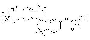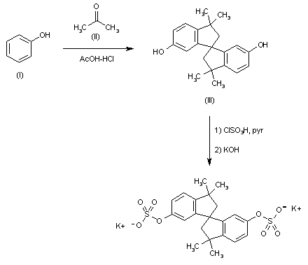 Condensation of phenol (I) with acetone (II) in refluxing HOAc/HCl affords diol (III), which is finally converted into the desired compound by first reaction with chlorosulfonic acid in pyridine followed by treatment with aqueous KOH.