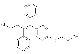 The condensation of desoxybenzoin (I) with tetrahydropyranyl ether (II) in aq. 48% NaOH containing TEBAC gives 1,2-diphenyl-4-(tetrahydropyranyloxy)-1-butanone (III), which by a Grignard condensation with 4-methoxyphenylmagnesium bromide (IV) in THF yields the monoprotected triphenylbutanediol (V). The deprotection of (V) with H2SO4 in ethanol/water at room temperature affords the triphenylbutane-1,4-diol (VI), which is cyclized with H2SO4 in hot ethanol/water to provide 2-(4-methoxyphenyl)-2,3-diphenyltetrahydrofuran (VII). The reaction of (VII) with 48% HBr in refluxing acetic acid gives a mixture of (E)- and (Z)-4-(4-hydroxyphenyl)-3,4-diphenyl-1-butanol that is separated by chemical working up to obtain the desired (Z)-isomer (VIII). The condensation of the phenolic OH of (VIII) with benzyl protected 2-bromoethanol (IX) by means of NaOH and tetrabutylammonium bromide in refluxing toluene/water gives the benzyloxyethyl ether (X). The reaction of the aliphatic OH group of (X) with PPh3 and CCl4 in acetonitrile yields the corresponding chloro derivative (XI), which is finally debenzylated by hydrogenation with H2 over Pd/C in ethyl acetate/ethanol.