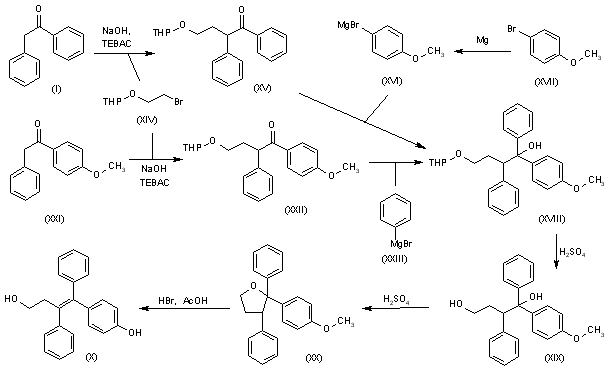 Condensation of desoxybenzoin (I) with 2-(tetra-hydropyranyloxy)ethyl bromide (XIV) by means of aqueous NaOH and TEBAC as before gives 1,2-diphenyl-4-(tetrahydropyranyloxy)-1-butanone (XV), which by a Grignard condensation with 4-methoxyphenylmagnesium bromide (XVI) -prepared from 4-bromoanisole (XVII) and Mg in THF- provides the triphenylbutanol derivative (XVIII). Cleavage of the THP-protecting group of compound (XVIII) with H2SO4 in ethanol/water at room temperature affords the butane-1,4-diol derivative (XIX), which is cyclized by means of H2SO4 in hot ethanol/ water to yield 2-(4-methoxyphenyl)-2,3-diphenyltetrahydrofuran (XX). Finally, this compound is treated with 48% HBr in refluxing AcOH to give 4-(4-hydroxyphenyl)-3,4-diphenyl-3-buten-1-ol (X) as a (Z):(E)-isomeric mixture, from which the desired (Z)-isomer is separated by chemical work up.