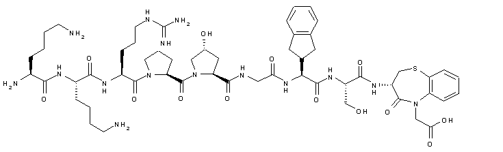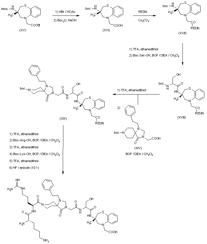 Synthesis of EN 290154: Cleavage of both the Fmoc protecting group and ethyl ester of (XV) by means of HBr in HOAc followed by Boc protection affords (XVI) which is then anchored to a chloromethylated resin to yield (XVII). Deprotection of dihydro-benzothiazepinone (XVII) with TFA in presence of ethanedithiol, followed by coupling with Boc-Ser-OH by means of BOP/DIEA in CH2Cl2, yields derivative (XVIII). Deprotection of (XVIIII) followed by coupling with intermediate (XIV) in the same conditions described for (XVII) affords derivative (XIX). Next steps include sequencial Boc removal and coupling with Boc-Arg(Tos)-OH and then Boc-Lys(Fmoc)-OH. Finally the product is cleaved from the resin by means of HF/anisole.