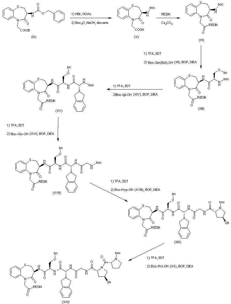 Cleavage of both the Z protecting group and ethyl ester of derivative (IX) with HBr in AcOH, followed by introduction of a Boc group by treatment with Boc2O in dioxane in the presence of NaOH, affords (X), which is then anchored to the resin via its Cs salt to yield (XI). Deprotection of the amine moiety of (XI) with TFA in the presence of EDT as a scavenger, followed by coupling with Boc-Ser(Bzl)-OH in the presence of BOP and DIEA, affords (XII). The peptidic chain is then elongated by successive deprotection with TFA/EDT and coupling of protected amino acids (Boc-Igl-OH (XIV), Boc-Gly-OH (XVI), Boc-Hyp-OH (XVIII) and Boc-Pro-OH (XX) with BOP/DIEA, providing derivative (XXI). (Scheme 28947001b).