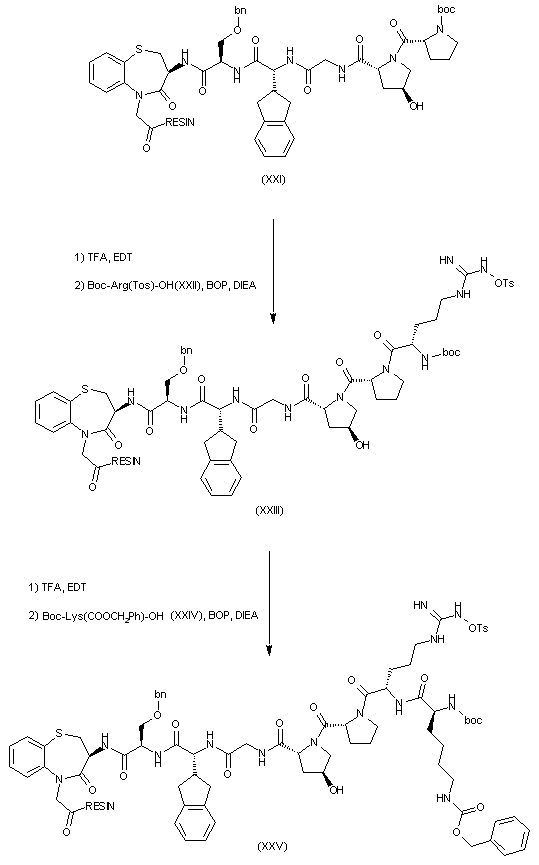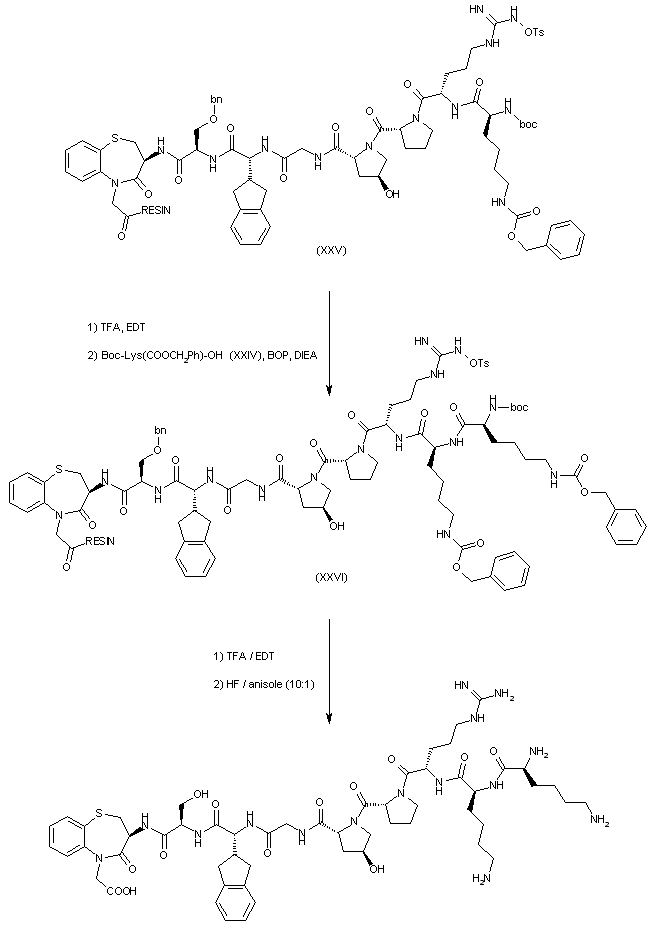 The peptidic chain is elongated by successive deprotection with TFA/EDT and coupling of protected amino acids (Boc Arg(Tos)-OH (XXII), and Boc-Lys(COOCH2Ph)-OH (XXIV)) with BOP/DIEA, providing derivative (XXV)(Scheme 28947001c).
