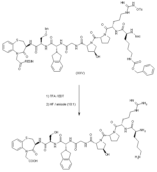 Derivative (XXIV) is finally deprotected and cleaved by a first treatment with TFA/EDT followed by HF in the presence of anisole. (Schemes 28946801d).