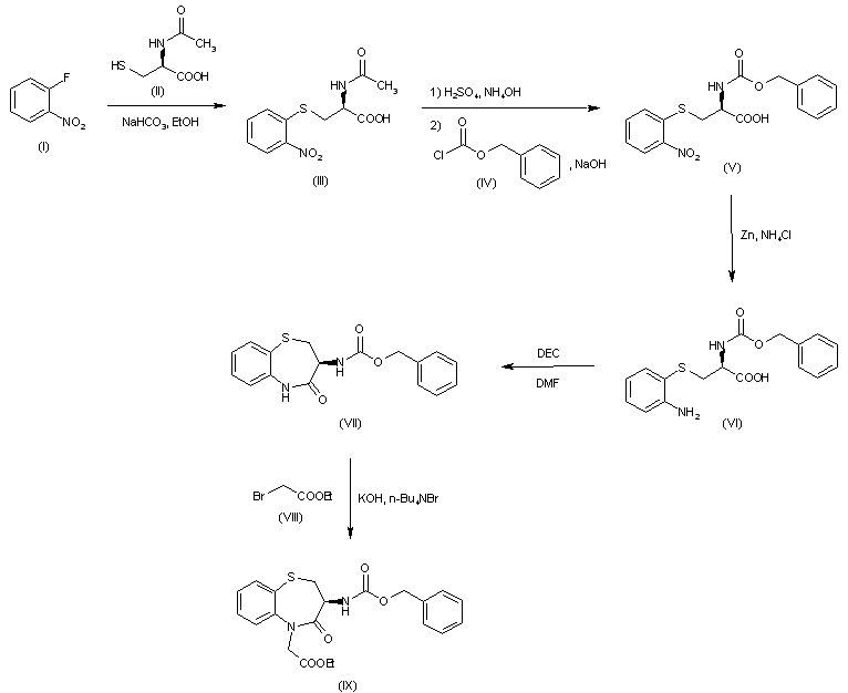 o-Fluoronitrobenzene (I) is converted into (III) by an aromatic nucleophilic substitution with N-Ac-Cysteine (II) in EtOH in the presence of NaHCO3. Derivative (III) is then deacetylated by means of H2SO4 and NH4OH and reprotected as its Z-form by reaction with (IV) in the presence of NaOH to provide (V). Reduction of the nitro moiety of (V) with Zn in MeOH and in the presence of NH4Cl affords amine (VI), which is then converted into lactam (VII) using 1-[3-(dimethylamino)propyl]-3-ethyl carbodiimide (DEC) hydrochloride in DMF. The next step is alkylation of (VII) with ethyl bromoacetate (VIII) in THF in the presence of KOH and n-Bu4NBr to give (IX) (Scheme 28946801a).