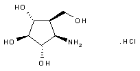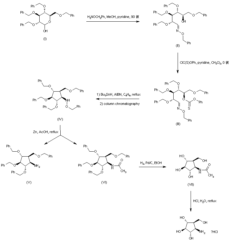 Tetra-O-benzyl glucose (I) was converted to the hexose oxime (II) upon treatment with O-benzyl hydroxylamine, and the free hydroxyl group of (II) was then condensed with phenyl chlorothioformate to yield the thiocarbonate (III). Radical cyclization of (III) in the presence of tributyltin hydride and azobis(isobutyronitrile), followed by chromatographic separation of the resulting epimeric mixture, furnished the cyclopentyl hydroxylamine derivative (IV). Reductive cleavage of the N-O bond with zinc in HOAc produced a mixture of amine (V) and the corresponding acetamide (VI). While direct hydrogenation of amine (V) only gave mixtures of products, hydrogenation of amide (VI) cleanly afforded the debenzylated compound (VII). Finally, acidic hydrolysis of (VII) gave the title amine as the hydrochloride salt.