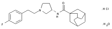 Condensation of (S)-3-amino-1-benzylpyrrolidine (I) with 1-adamantanecarbonyl chloride (II) by means of Et3N in dichloromethane affords amide (III), which is then debenzylated by hydrogenolysis over Pd/C and hydrazine monohydrate to provide amine (IV). Subsequent N-alkylation of (IV) with tosylate (V) in acetonitrile in the presence of K2CO3 furnishes the corresponding alylated compound (VI), which is finally converted into the desired hydrochloride monohydrate derivative by first treatment with HCl:isopropanol in ethyl acetate followed by recrystallization in EtOH:H2O using activated carbon.
