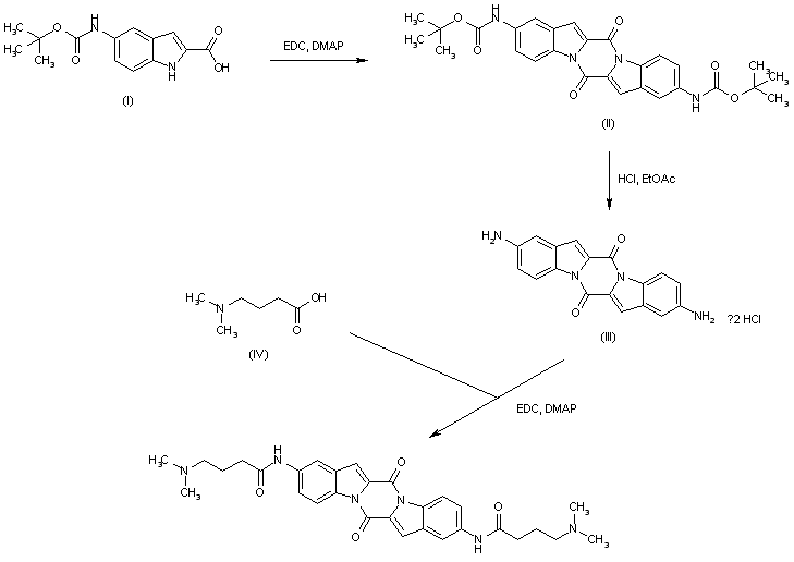 Treatment of the indolecarboxylic acid (I) with EDC in the presence of DMAP gave rise to the dimeric diketopiperazine (II). Acid cleavage of the Boc protecting group of (II) afforded the free diamine (III), which was then coupled with 4-(dimethylamino)butyric acid (IV) using EDC and DMAP to furnish the title diamide.
