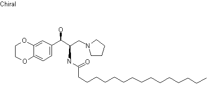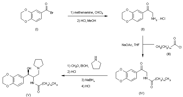 The condensation of 2,3-dihydrobenzodioxin-6-carbaldehyde (I) with 5(S)-phenylmorpholin-2-one (I) in refluxing toluene gives the adduct (III), which is treated first with pyrrolidine (IV) in chloroform and then with HCl in refluxing methanol to yield the pyrrolidide (V). The reduction of (V) with LiAlH4 in THF affords compound (VI), which is treated with H2 over Pd/C in THF/methanol/water to provide the aminoalcohol (VII). Finally, the amino group of (VII) is acylated by means of palmitoyl chloride (VIII) and DIEA in dichloromethane to furnish the target palmitoylamide.