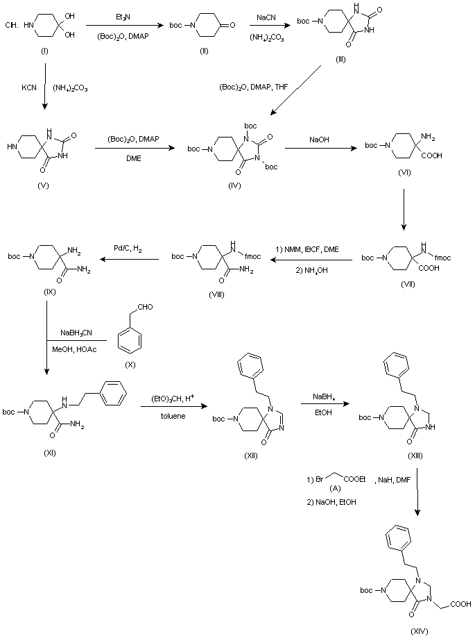 Synthesis of intermediate (XIV): Protection of 4-piperidone (I) with (Boc)2O in presence of DMAP and Et3N yields (II), which is converted into hydantoin (III) by means of NaCN in presence of (NH4)2CO3. Hydantoin (III) is then fully protected to provide (IV) by treatment with (Boc)2O and DMAP in THF. Alternatively (IV) can be obtained by treatment of 4-piperidone (I) with KCN in presence of (NH4)2CO3 to yield hydantoin (V), which is then protected with (Boc)2O and DMAP in DME. Hydrolysis of (IV) with NaOH affords aminoacid (VI) whose free amine is protected to provide carboxylic acid (VII). Treatment of (VII) with isobutyl chloroformate (IBCF) in DME in presence of NMM, followed by aqueous ammonia, yields amide (VIII), which is converted to (IX) by hydrogenation with H2 over Pd/C. Reductive amination of (IX) with aldehyde (X) affords amino amide (XI), which is treated with triethyl orthoformate to provide spirocycle (XII). Reduction of (XII) with NaBH4 in EtOH gives (XIII), which is alkylated with ethyl bromoacetate (A) followed by hydrolysis with NaOH to yield intermediate (XIV).