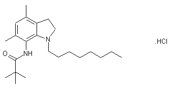Indole derivative (I) is converted into acetyl indoline (II) by first reduction with NaBH3CN in HOAc followed by acetylation with Ac2O in benzene or in CHCl3. Bromination of (II) with Br2 in HOAc yields derivative (III), which is then nitrated with fuming nitric acid in H2SO4/HOAc or with HNO3/Ac2O to afford nitroindoline (IV). Removal of the acetyl group of (IV) by means of NaOH or HCl in MeOH, followed by alkylation of the resulting indoline with NaH and octyl iodide (V) or octyl bromide (VI) in DMF, provides derivative (VII). Hydrogenation of (VII) over Pd/C in MeOH or benzene yields aminoindoline derivative (VIII), which is finally condensed with pivaloyl chloride (IX) in CHCl3 in the presence of Et3N to furnish the desired compound. Alternatively, conversion of (IV) into the target compound can be achieved as follows: Hydrogenation of the nitro moiety of (IV) over Pd/C in MeOH gives acetyl aminoindoline derivative (X), which is then coupled to pivaloyl chloride (IX) in CHCl3 in the presence of Et3N to afford derivative (XI). Finally, (XI) is hydrolyzed with NaOH in MeOH and the resulting secondary amide is condensed with octyl bromide (VI) in DMF in the presence of K2CO3.