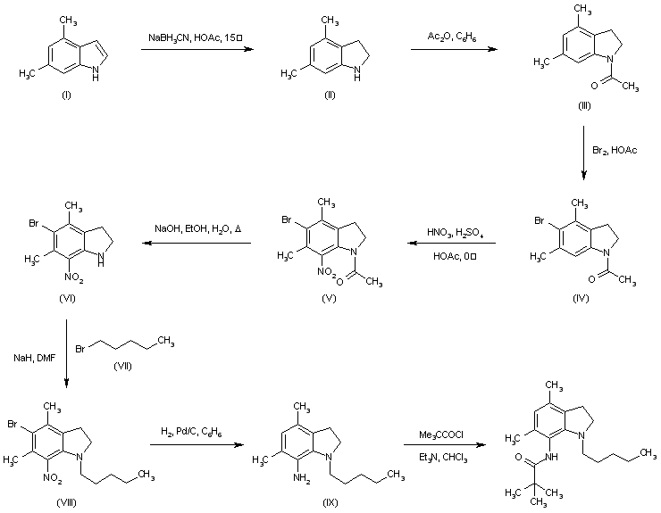 The reduction of 4,6-dimethylindole (I) with NaBH3CN in AcOH produced indoline (II), which was acetylated with Ac2O to give amide (III). Introduction of a blocking group at position 5 of (III) was effected by bromination in AcOH, yielding (IV). Then, nitration of (IV) with HNO3/H2SO4 furnished the 7-nitroindoline (V). After basic hydrolysis of the acetamide group of (V), the resulting indoline (VI) was N-alkylated with n-pentyl bromide (VII) and NaH to afford (VIII). Reduction of the nitro group of (VIII) with simultaneous hydrogenolysis of the bromine atom was carried out by hydrogenation over Pd/C to produce amino indoline (IX). Finally, the title amide was obtained by coupling of (IX) with pivaloyl chloride in the presence of Et3N.
