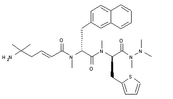 The title compound was prepared by stepwise peptide synthesis starting from N-Fmoc-N-methyl-D-thienylalanine (I), which was condensed with trimethyl hydrazine (II) to give hydrazide (III). Removal of the Fmoc protecting group with piperidine in DMF provided amine (IV), which was subsequently coupled with N-methyl-D-naphthylalanine (V) in the presence of EDC and HOAt to furnish the dipeptide hydrazide (VI). After removal of the Fmoc group of (VI) with piperidine, the resulting amine (VII) was coupled with N-Boc-5-amino-5-methylhex-2-enoic acid (VIII), yielding amide (IX). Final deprotection of the Boc group of (IX) using trifluoroacetic acid afforded the title compound.