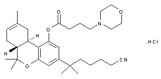 | 合成路线图解说明: Grignard reaction between 3,5-dimethyoxybenzonitrile (I) and 4-bromophenoxybutane (II) in the presence of Mg turnings in THF, followed by hydrolysis with HCl, affords ketone (III), which is then treated with TiCl4 in dichloromethane and dimethyl zinc (Me2Zn) in toluene to provide dimethylpentane derivative (IV). Bromination of (IV) is then accomplished by first azeotroping with benzene followed by treatment with BBr3 in dichloromethane, affording bromo derivative (V). Condensation of resorcinol derivative (V) with p-menth-2-ene-1,8-diol (VI) in refluxing benzene in the presence of p-toluensulfonic acid furnishes compound (VII), whose bromo group is substituted by a cyano group by treatment with NaCN in DMSO giving derivative (VIII). Finally, condensation of (VIII) with 4-morpholinobutyric acid hydrochloride (IX) by means of DCC in dichloromethane provides the target product. |