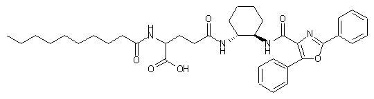 D,L-Glutamic acid (I) was sequentially protected as the gamma-allyl ester (III), upon treatment with allyl alcohol (II) and chlorotrimethylsilane, followed by conversion to the trichloroethyl carbamate (V) by means of chloroformate (IV), and then reaction of (V) with benzyl bromide to afford the alpha-benzyl ester (VI). Deprotection of the trichloroethyl carbamate of (VI) by treatment with zinc dust and HOAc and subsequent condensation of the resulting amine with decanoyl chloride (VII) furnished amide (VIII). The allyl ester of (VIII) was then selectively cleaved by using tetrakistriphenylphosphine palladium(0) and morpholine to give carboxylic acid (IX). trans-1,2-Diaminocyclohexane (X) was protected as the mono tert-butyl carbamate (XI) and then coupled with acid (IX) in the presence of diethylphosphoryl cyanide to yield amide (XII). After acidic Boc cleavage of (XII), coupling of the resulting amine with 2,5-diphenyloxazole-4-carboxylic acid (XIII) by means of bromo-tris(pyrrolidino)phosphonium hexafluorophosphate (PyBroP) afforded (XIV). Finally, hydrolysis of the benzyl ester of (XIV) with LiOH provided the corresponding carboxylic acid.