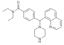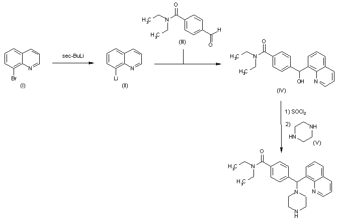 8-Bromoquinoline (I) is treated with sec-BuLi in THF to afford lithium derivative (II), which then reacts with carbaldehyde (III) in THF to provide alcohol (IV). Finally, (IV) is converted into the desired compound by chlorination with SOCl2 in CH2Cl2 followed by reaction with piperazine (V) in refluxing acetonitrile.