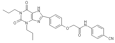 Alkylation of 4-hydroxybenzaldehyde (I) with iodoacetic acid afforded 4-formylphenoxyacetic acid (II). This was condensed with 5,6-diamino-1,3-dipropyluracil (III) to produce imine (IV), which was oxidatively cyclized to xanthine (V) in the presence of ferric chloride. After activation of (V) as the corresponding acid chloride (VI), coupling with 4-aminobenzonitrile (VII) furnished the title amide.