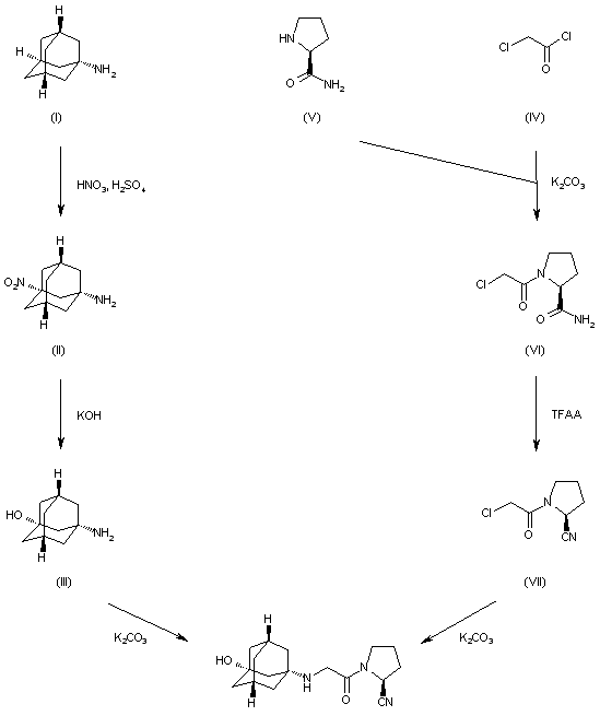 Finally 3-hydroxyadamantan-1-amine (III) is condensed with the 1-(chloroacetyl)-L-prolinenitrile (VII) by means of K2CO3 in dichloromethane to afford the target adamantane derivative. |